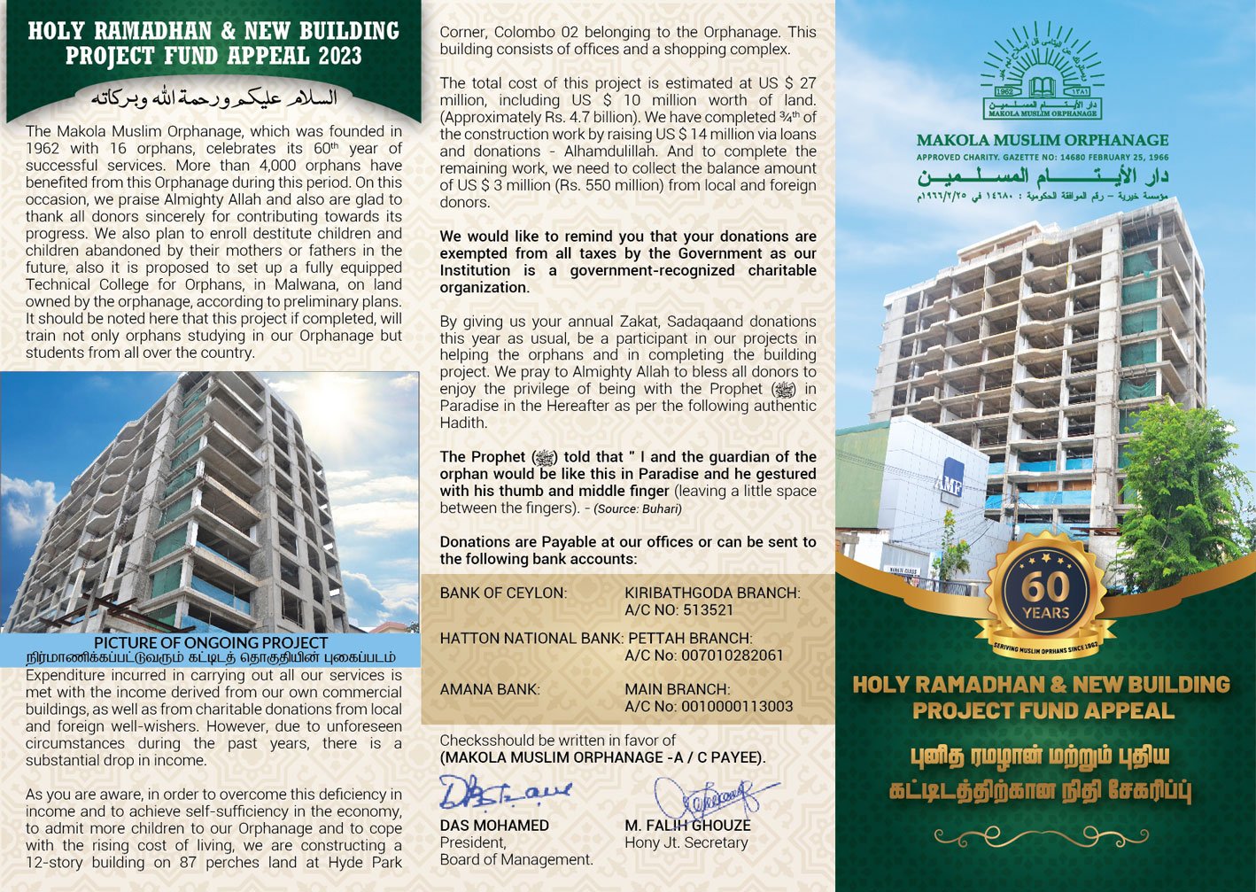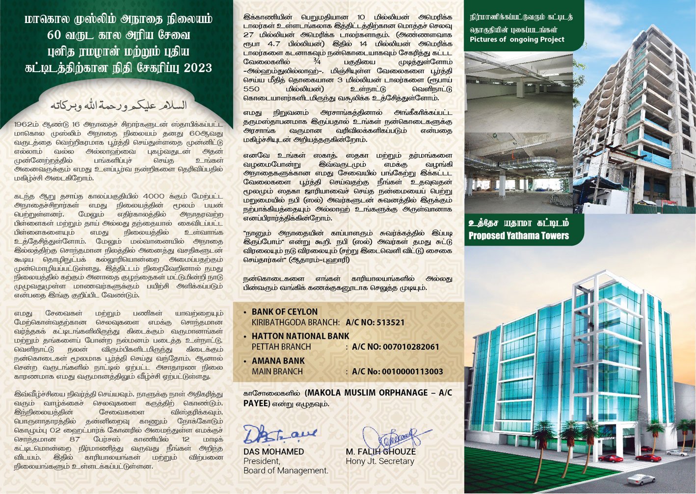 By the grace and blessings of Almighty Allah, the Orphanage commenced work on the project on 12/12/2014 and we are pleased to inform that the project has progressed upto the eighth floor of the proposed "Yathama Towers", which was an ambitious and a long expected Endowment (Waqf) Project of the...